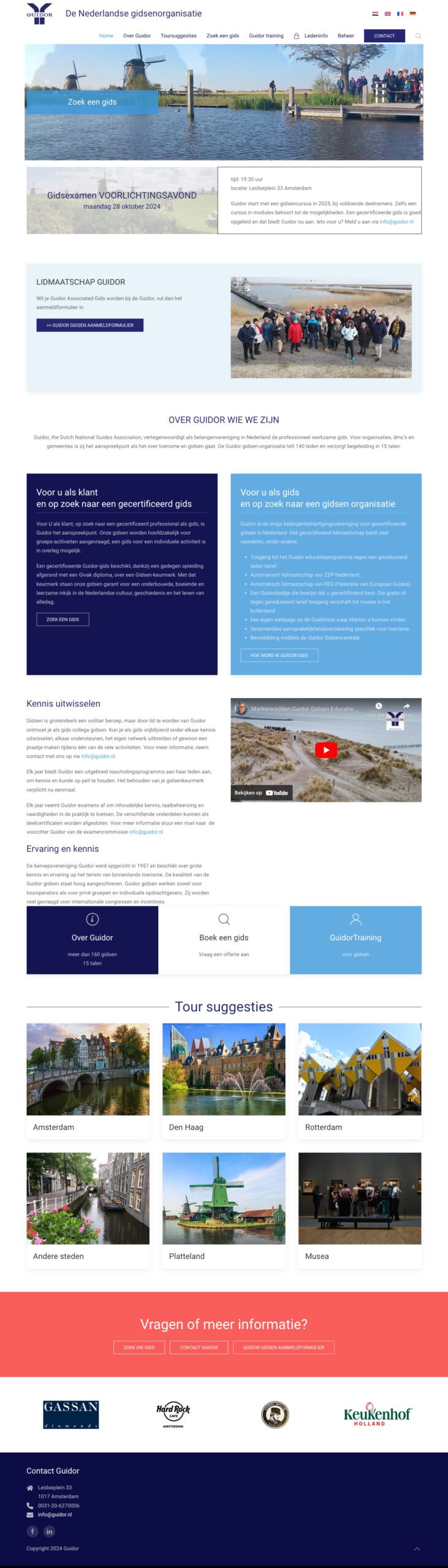Onlangs is de website van Guidor online gegaan. Guidor, the Dutch National Guides Association, vertegenwoordigt als belangenvereniging in Nederland de professioneel werkzame gids. Voor organisaties, dmc’s en gemeentes is zij het aanspreekpunt als het over toerisme en gidsen gaat. De Guidor gidsen-organisatie telt 140 leden en verzorgt begeleiding in 15 talen. Op de website is uitgebreide informatie te vinden. Daarnaast kan er gezocht worden binnen het gidsenaanbod op basis van gewenste taal. De aangesloten gidsen kunnen inloggen op het besloten gedeelte en zo hun profiel beheren, maar ook specifieke informatie bekijken. Ook kunnen zij zich inschrijven binnen het educatiegedeelte op lezingen, excursies, cursussen, rondleidingen en dergelijke. Ook is de backoffice volledig geïntegreerd binnen de website. Hierdoor kunnen in een volledige webbased omgeving alle beheerfuncties worden uitgevoerd. Dit maakt alle werkzaamheden erg efficient en aanzienlijk gebruiksvriendelijker ten opzichte van hiervoor.