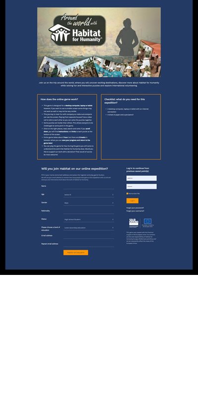 Afgelopen week is de nieuwe online game van Habitat for Humanity online gegaan. In Habitat Around the World gaat de speler de wereld rond door het bezoeken van negen landen. In ieder land wacht hem of haar een uitdagende opdracht. Op deze wijzen ontdekt de speler meer over Habitat for Humanity terwijl hij/zij leuke en interactieve puzzels oplost en internationaal vrijwilligerswerk ontdekt.