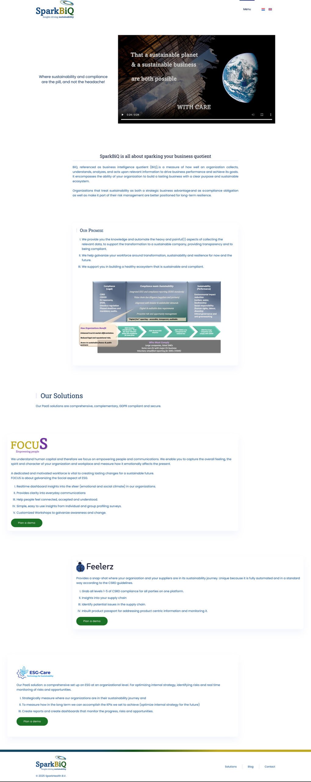 Recent is de nieuwe website van SparkBIQ online gegaan. BiQ, ook wel Business Intelligence Quotient (BiQ) genoemd, is een maatstaf voor hoe goed een organisatie relevante informatie verzamelt, begrijpt, analyseert en ernaar handelt om de bedrijfsprestaties te verbeteren en haar doelen te bereiken. Het omvat het vermogen van uw organisatie om een duurzame onderneming op te bouwen met een duidelijk doel en een duurzaam ecosysteem. Organisaties die duurzaamheid beschouwen als een strategisch bedrijfsvoordeel én als een complianceverplichting, en het onderdeel maken van hun risicomanagement, zijn beter gepositioneerd voor veerkracht op de lange termijn. SparkBIQ draait om het stimuleren van uw bedrijfsquotiënt. Zij bieden u de kennis en automatiseren de zware en pijnlijke(!) aspecten van het verzamelen van de relevante gegevens, ter ondersteuning van de transformatie naar een duurzaam bedrijf, het bieden van transparantie en het voldoen aan wet- en regelgeving. Zij helpen uw personeel te motiveren om te transformeren, duurzaam te zijn en veerkracht te tonen, zowel nu als in de toekomst. Zij ondersteunen u bij het opbouwen van een gezond ecosysteem dat duurzaam en compliant is. Op de website vindt u uitgebreide informatie over alle aspecten, zowel in het Engels als in het Nederlands.
