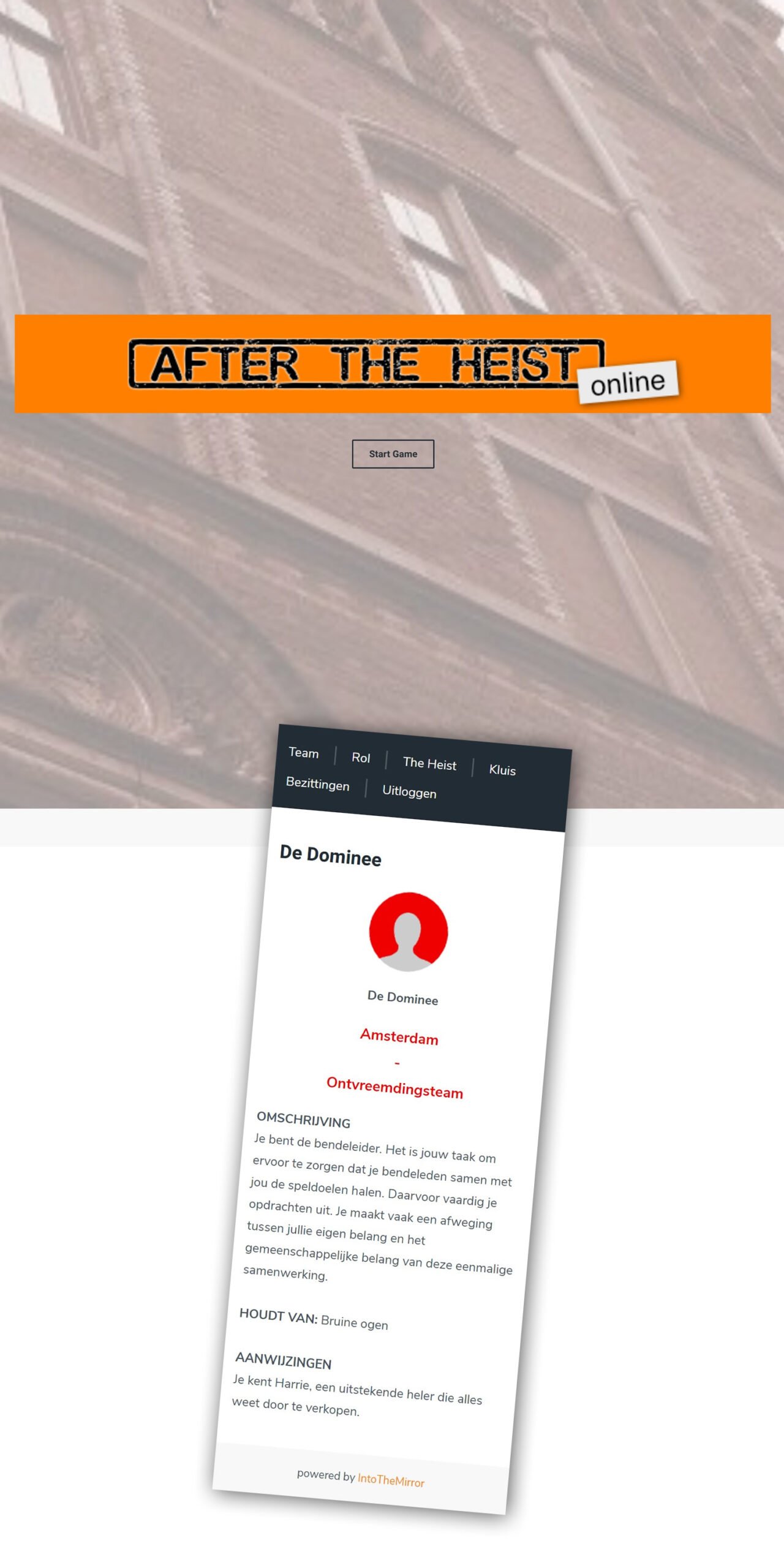 Afgelopen week is de online real life game ‘After The Heist’ online gegaan. ‘After the Heist Online’ is een Online Escape Game. Deze professioneel begeleide ervaring is anders dan andere online escape games. Bij deze social interaction game staat de (online) communicatie onderling voorop. Via interactive storytelling wordt ervaren hoe het is om een crimineel te zijn. Ook wordt de spanning rondom het zetten van een kraak beleeft. En die ene vraag: ‘Wie kan ik vertrouwen?’. Dat alles in de rol van crimineel en ondersteund met puzzels. De uitkomst van ‘After the Heist Online’ wordt helemaal door de spelers bepaald! ‘After the Heist’ is een break-in escape room: je moet je ergens naar binnen puzzelen in plaats van eruit ontsnappen. De deelnemers dienen over een desktop/laptop/tablet te beschikken met een beeldbelapplicatie èn een smartphone. Communicatie verloopt via de beeldbelapplicatie. Via een speciaal voor de game ontwikkelde webapplicatie op de mobiel worden puzzels opgelost. Op deze wijze hebben de deelnemers meer oog voor elkaar via de beeldbelapplicatie.