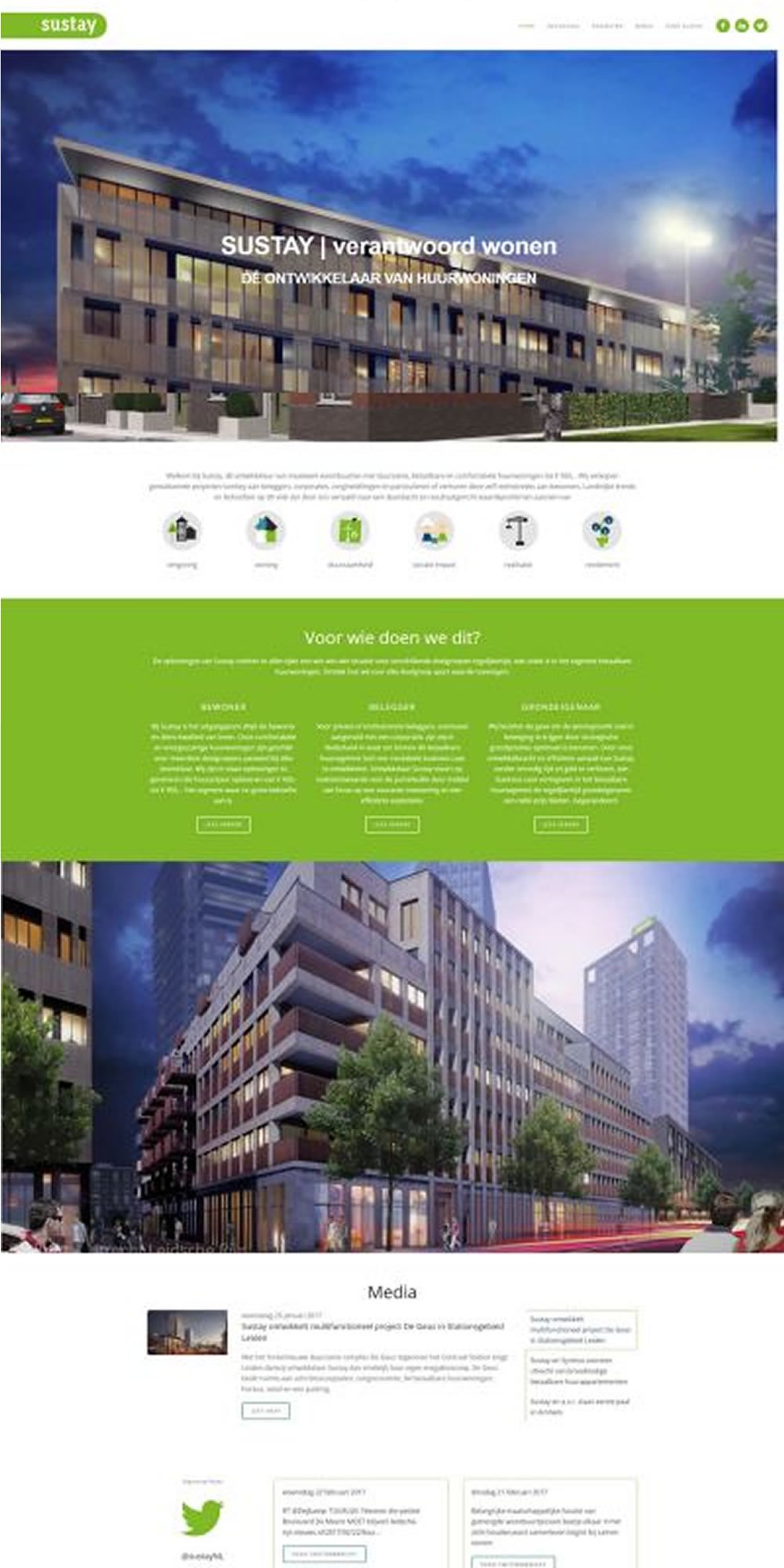 Gisteren is de nieuwe website van Sustay online gegaan. Sustay is dé ontwikkelaar van maatwerk woonbuurten met duurzame, betaalbare en comfortabele huurwoningen tot € 950,-. Zij verkopen gerealiseerde projecten turnkey aan beleggers, corporaties, zorginstellingen en particulieren of verhuren deze zelf rechtstreeks aan bewoners. De website bevat uitgebreide informatie voor de verschillende doelgroepen van Sustay. Daarnaast zijn voorbeelden van gerealiseerde projecten beschikbaar. Uiteraard is de website responsive en volledig via een CMS te beheren.