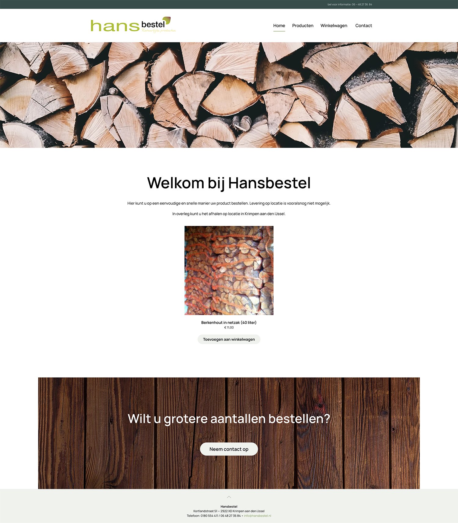 Soms zijn er projecten die zo snel mogelijk online moeten en soms zijn er projecten die direct online moeten ;-). De webshop van Hansbestel valt in deze laatste categorie. Hansbestel is onderdeel van Hoveniersbedrijf Hans Broere en er was een grote partij openhaardhout beschikbaar. Het was dus wenselijk om zo spoedig mogelijk een webshop online te krijgen waar de bezoeker direct het haardhout kon bestellen. Binnen een halve dag heb ik toen een webshop gerealiseerd inclusief online afrekenmogelijkheid middels iDEAL. De bestellingen volgden direct na de livegang! Binnenkort zal de webshop verder worden uitgebreid met onder andere buitenkranen en sedumdaken.