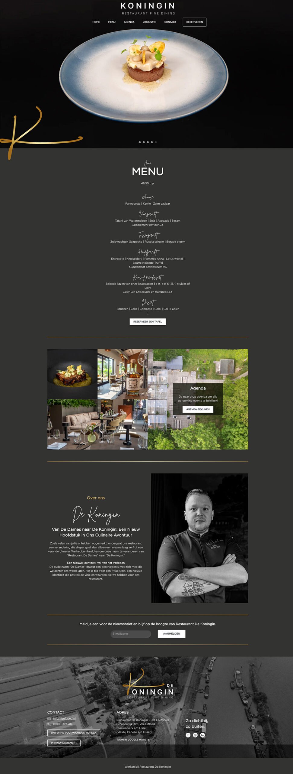 Vandaag is de website van Restauran De Koningin online gegaan. Dit restaurant bevindt zich op Leefgoed de Olifant in Nieuwerkerk aan den IJssel en is een gastronomisch restaurant. Chef-kok Tim Conijnenberg heeft bij meerdere renomeerde zaken gewerkt. Hij is nu Chef op het Leefgoed waarbij hij het restaurant naar een sterrenniveau wilt tillen. Op de website vind je uitgebreide informatie over het restaurant en uiteraard altijd het maandmenu, compleet met fraaie foto’s van de verschillende gangen.