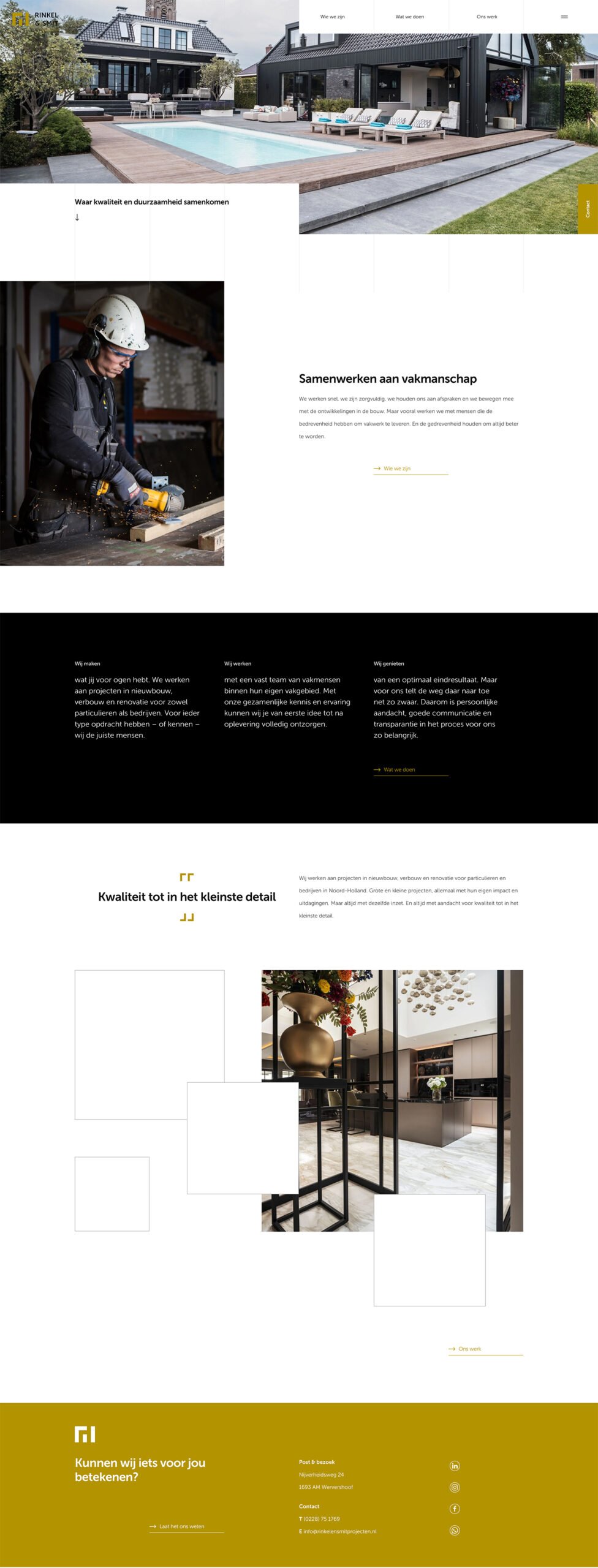 Vandaag is de website van Rinkel & Smit Projecten online gegaan. Rinkel & Smit projecten werkt aan projecten in nieuwbouw, verbouw en renovatie voor particulieren en bedrijven in Noord-Holland. Grote en kleine projecten, allemaal met hun eigen impact en uitdagingen. Maar altijd met dezelfde inzet. En altijd met aandacht voor kwaliteit tot in het kleinste detail. Op de website uitgebreide informatie over het bedrijf en wat ze doen. En dit allemaal zeer smaakvol ontworpen door Boven Westen.