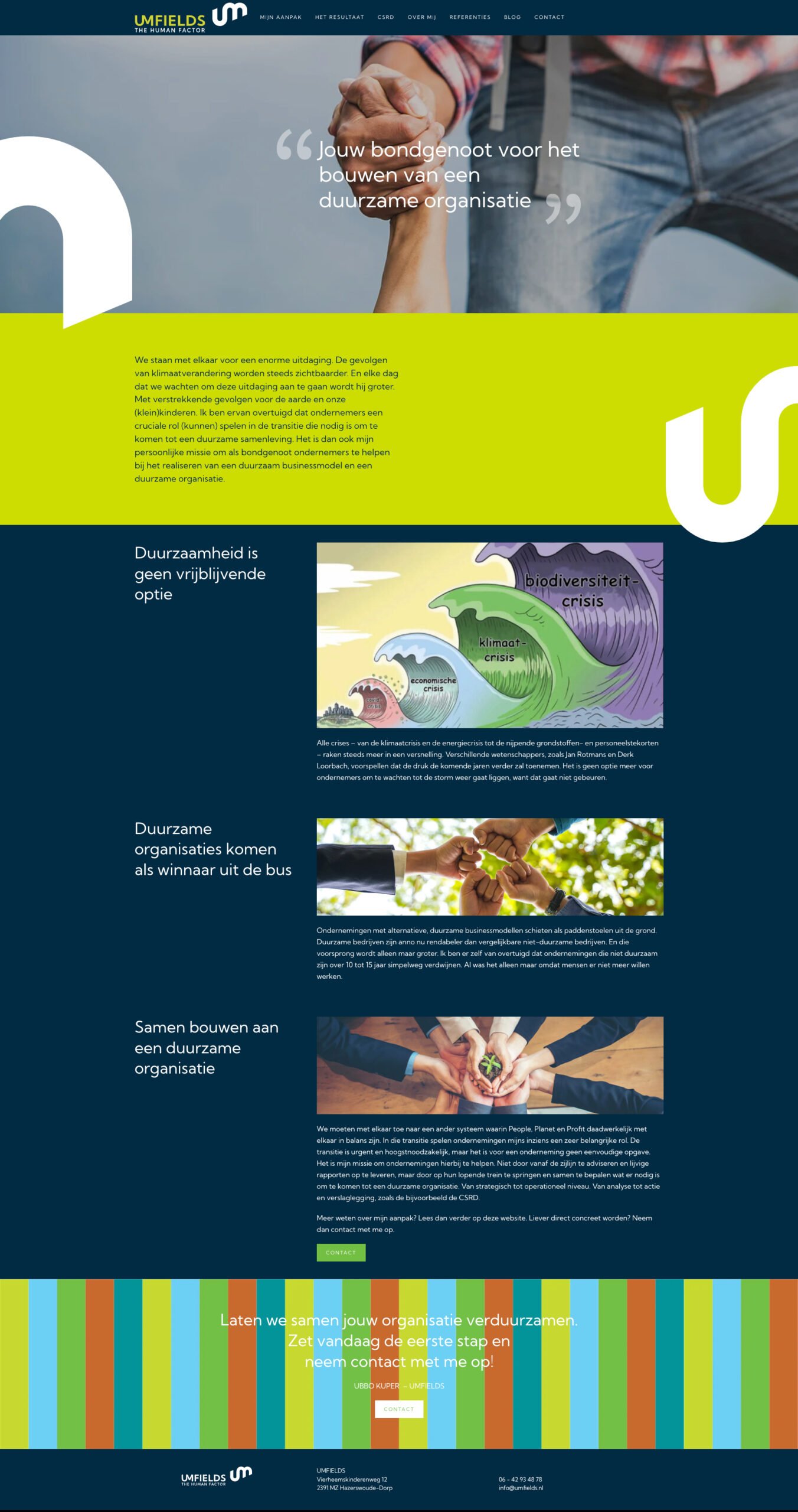 Gisteren is de nieuwe website van Umfields online gegaan. We staan met elkaar voor een enorme uitdaging. De gevolgen van klimaatverandering worden steeds zichtbaarder. En elke dag dat we wachten om deze uitdaging aan te gaan wordt hij groter. Met verstrekkende gevolgen voor de aarde en onze (klein)kinderen. Ubbo Kuper is ervan overtuigd dat ondernemers een cruciale rol (kunnen) spelen in de transitie die nodig is om te komen tot een duurzame samenleving. Het is dan ook zijn persoonlijke missie om als bondgenoot ondernemers te helpen bij het realiseren van een duurzaam businessmodel en een duurzame organisatie. Op de wewbsite vind je uitgebreide informatie over zijn diensten en uiteraard over Ubbo zelf.