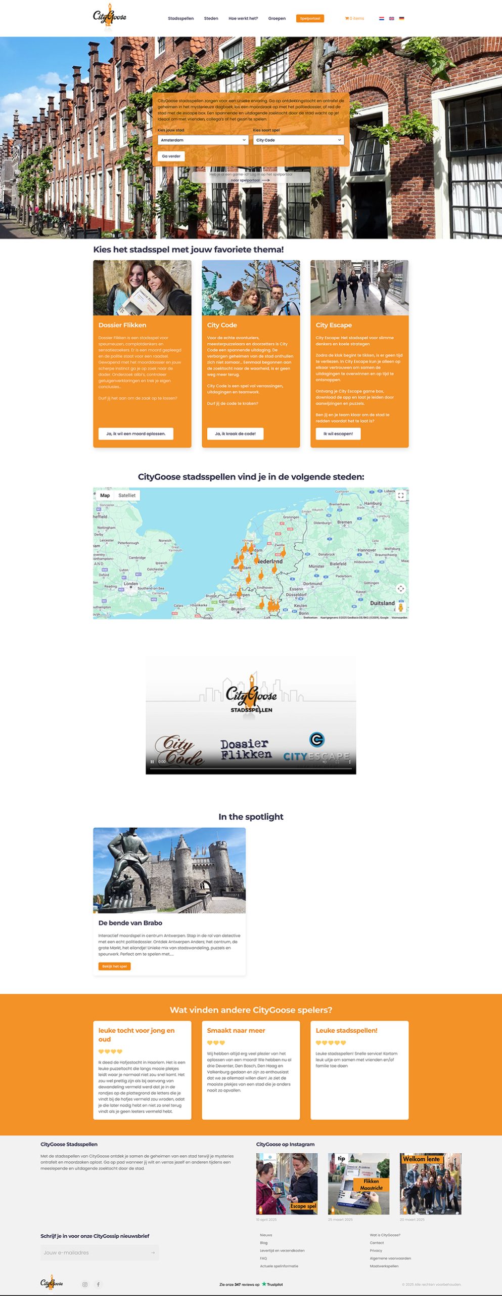 Recentelijk is de nieuwe website van CityGoose online gegaan. CityGoose stadsspellen zorgen voor een unieke ervaring. Ga op ontdekkingstocht en ontrafel de geheimen in het mysterieuze dagboek, los een moordzaak op met het politiedossier, of red de stad met de escape box. Een spannende en uitdagende zoektocht door de stad wacht op je! Ideaal om samen te spelen. De stadsspellen zijn ideaal als familie-uitje, vrijgezellenfeestje of groepsuitje. Op de website kunnen voor verschillende steden spellen worden besteld. In diverse steden zijn zelfs meerdere soorten spellen beschikbaar. Na het bestellen wordt het spel thuisbezorgd en kan het op ieder gewenst moment worden gespeeld. Ieder spel heeft ook een unieke toegangscode waarmee kan worden ingelogd op het spelportaal. Hier is allerlei informatie te vinden over het spel en kunnen de oplossingen worden gecontroleerd en mocht je er niet uitkomen; ook hints worden opgevraagd. De website bevat dus ook een uitgebreide backend-functionaliteit waarmee niet alleen de website en de webshop maar ook het volledige spelportaal kan worden beheerd. In de toekomst zullen meerdere steden worden toegevoegd en zal het ook in andere talen beschikbaar komen.