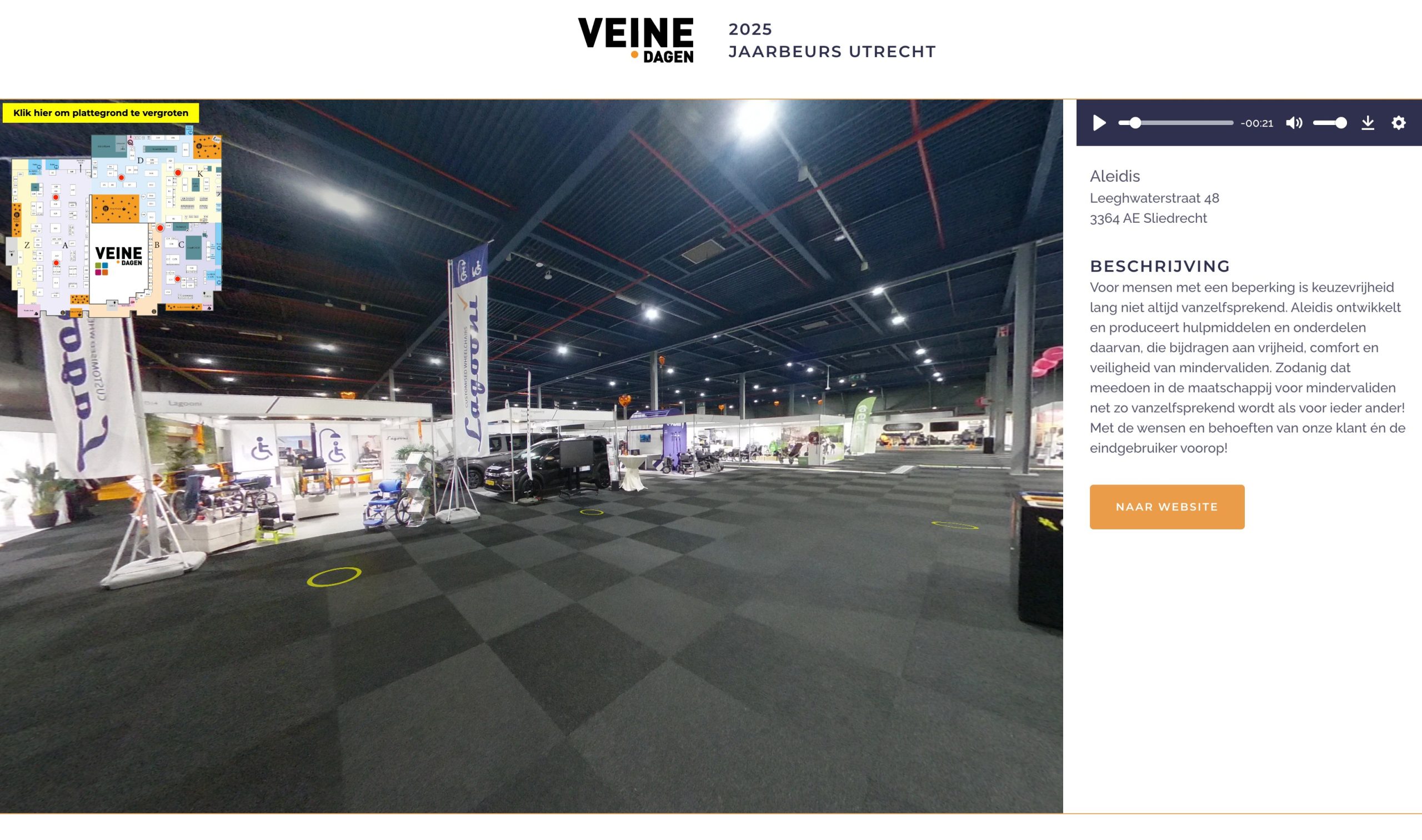 Van 20 tot en met 22 maart 2025 stond de Jaarbeurs Utrecht in het teken van VeineDagen & ZiezoBEURS. Op de VeineDAGEN & ZiezoBEURS draait het om iedereen met een beperking. Om de standhouders ook na de beursdagen toegankelijk te houden voor de bezoekers is de beurs volledig virtueel te bezoeken. Door middel van 700 360-graden foto’s kan er over de beurs worden gewandeld en bij het bezoeken van een stand verschijnt automatisch de informatie van de standhouder en wordt deze informatie automatisch voorgelezen. Hierdoor is deze informatie ook voor bezoekers met een visuele beperking beschikbaar. Op de virtuele beurs staan 235 bedrijven klaar om de bezoekers te ondersteunen, te informeren en te inspireren.