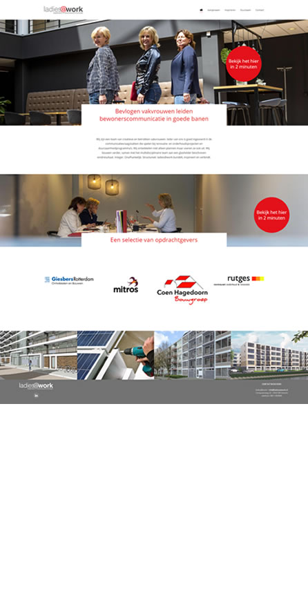Woensdagmiddag 25 oktober 2018 is de nieuwe website van ladies@work online gegaan. ladies@work is een team van creatieve en betrokken vakvrouwen en ieder van hen is goed ingevoerd in de communicatievraagstukken die spelen bij renovatie- en onderhoudsprojecten en duurzaamheidprogramma’s. Zij ontwikkelen niet alleen plannen maar voeren ze ook uit. Zij bouwen verder, samen met het multidisciplinaire team aan een glashelder beschreven eindresultaat. Integer. Onafhankelijk. Structureel. ladies@work bundelt, inspireert en verbindt. En de website draagt dit uit. In iedere vezel, ‘voor en achter de schermen’.