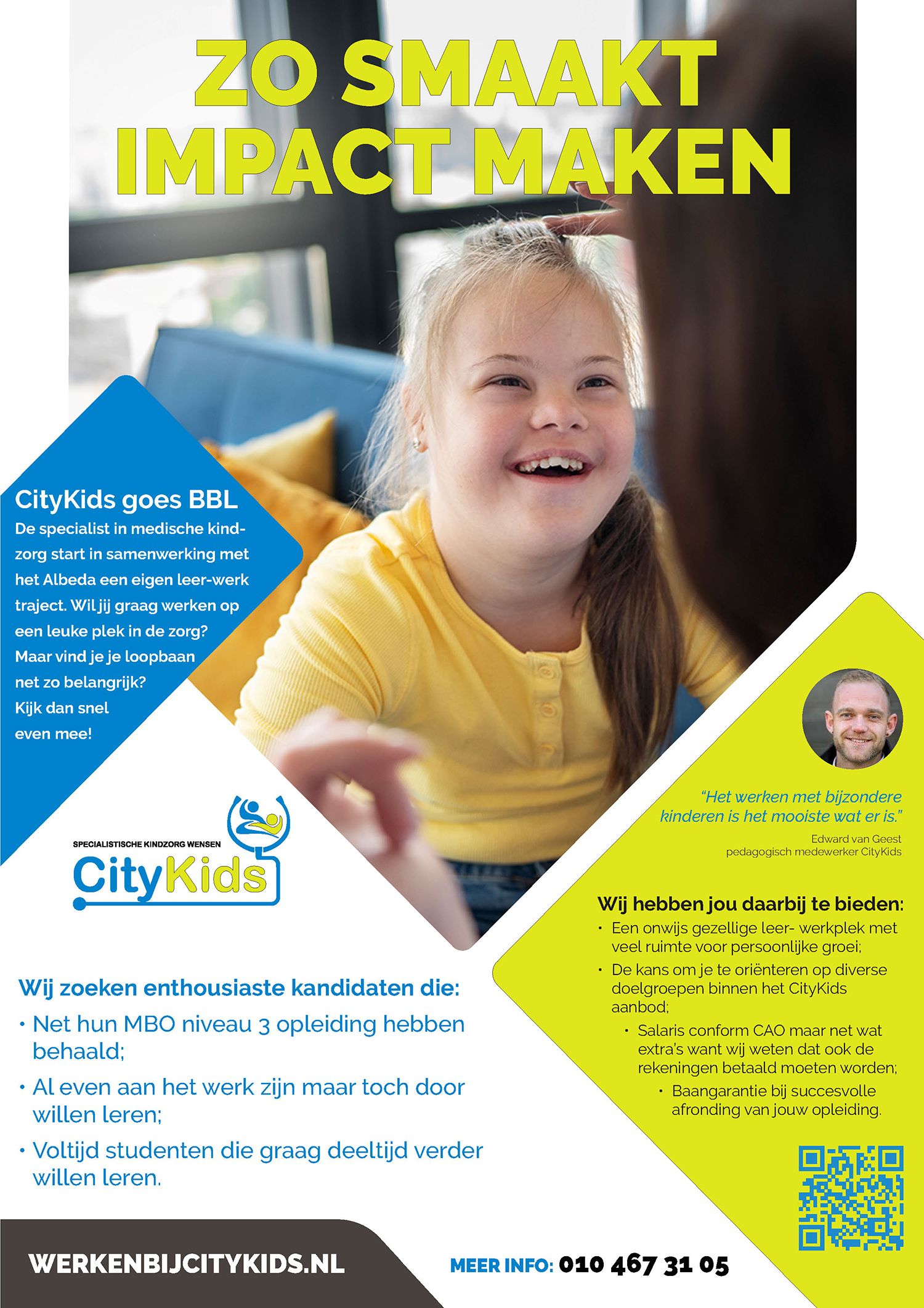 CityKids is een Medische Kindzorg Instelling en biedt verschillende vormen van zorg en behandeling aan kinderen en jongeren van 0 tot 23 jaar met een beperking en/of verpleegkundige zorgvraag. CityKids heeft vestigingen in 3 regio’s in Nederland: Rijnmond, Haaglanden en de Zuid-Hollandse eilanden. CityKids is altijd op zoek naar gemotiveerde medewerkers met een hart voor kinderen en jongeren met een ontwikkelingsachterstand. Binnenkort start CityKids in samenwerking met Albeda Zorgcollege Rotterdam een eigen BBL opleidingsklas. Na een sollicitatieprocedure start men met 4 dagen werk binnen één van de locaties van CityKids en gaat men één dag naar school binnen Albeda Zorgcollege. Iedere nieuwe medewerker in opleiding heeft een collega die werkzaam is in hetzelfde functiegebied en die vanuit de praktijk zorgt voor de juiste ondersteuning. Voor de promotie van deze opleiding heb ik onder andere deze poster ontworpen.